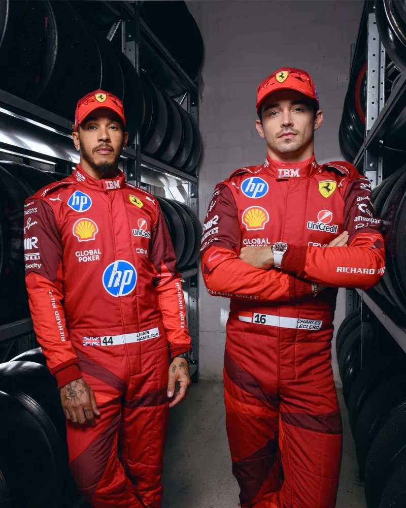 虎扑11月14日讯 法拉利车队发布了F1拉斯维加斯大奖赛的特别版赛车服和赛车帽,留念与服装赞助商的多年协作。两位车手汉密尔顿和勒克莱尔作为模彪炳镜。